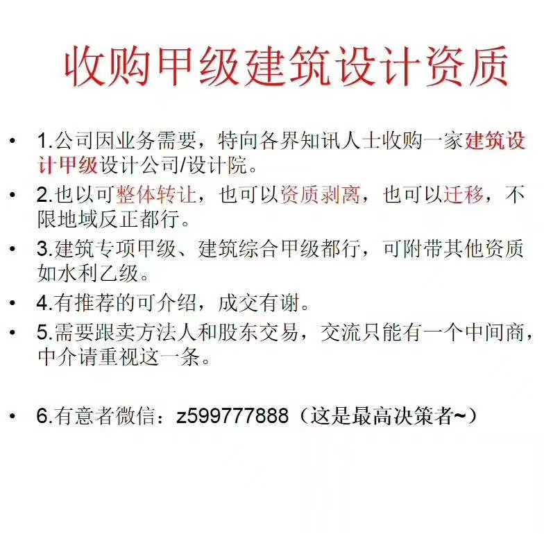 1.公司因业务需要,特向各界知讯人士收购一家建筑设计甲级设计公司/设计院。2.也以可整体转让,也可以资质剥离,也可以迁移,不限地域反正都行。3.建筑专项甲级、建筑综合甲级都行,可附带其他资质如水利乙级。4.有推荐的可介绍,成交有谢。5.需要跟卖方法人和股东交易,交流只能有一个中间商,中介请重视这一条。4.有意者私信我:z599777888